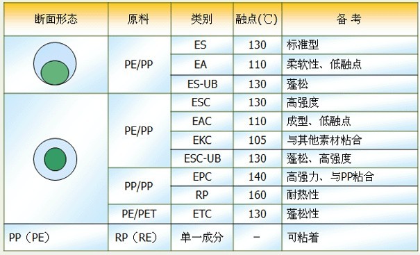 復(fù)合纖維的特點: ·通過熱粘合加工可形成無紡布 。o粘合劑無紡布) ·易于熱熔加工 ·可通過加熱形成各種形狀 ·可與薄膜粘合 聚烯烴纖維的特長 ·所有纖維中最輕的一種 ·耐藥性能優(yōu)秀 ·由于具有抗水性使其具備速干的特性 ES纖維的種類和特點