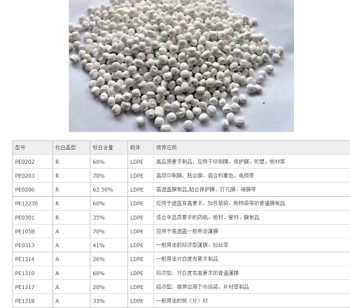 白色母是以優(yōu)質(zhì)進(jìn)口金紅石型鈦白粉為主要原料,經(jīng)與載體樹脂和分散劑,潤滑劑等多種助劑混合,并經(jīng)高性能雙螺桿擠出機(jī)充分混煉,擠出造粒而成,具有在基體樹脂中分散性好,白度高,加工性能好等優(yōu)點.此款白色母鈦白粉含量在15%左右,具有耐曬,抗老化的特點,適合用于抽粒,注塑等生產(chǎn)工藝。